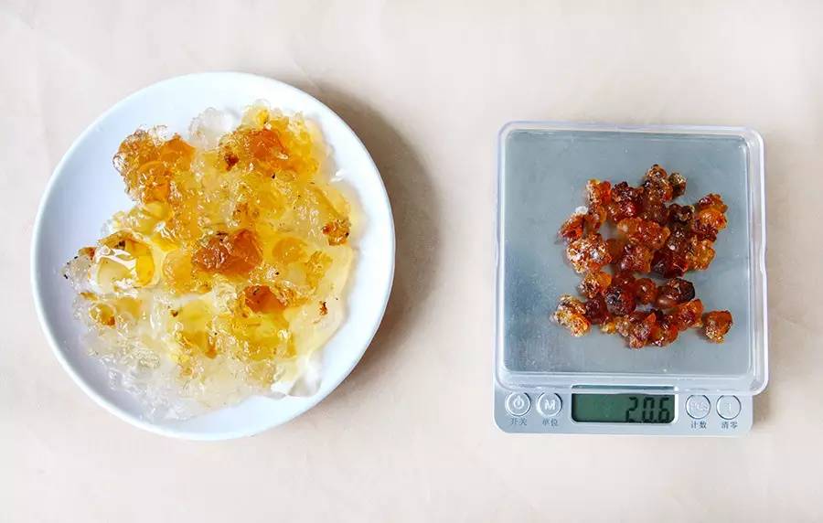 ▲ 经过打磨抛光的桃胶,看起来完美无瑕,卖相很好。但经过泡发和熬煮后,汤质反而未必如原生态桃胶的浓稠。其好处是,比原生桃胶杂质少,更易清洗,但售价极高。