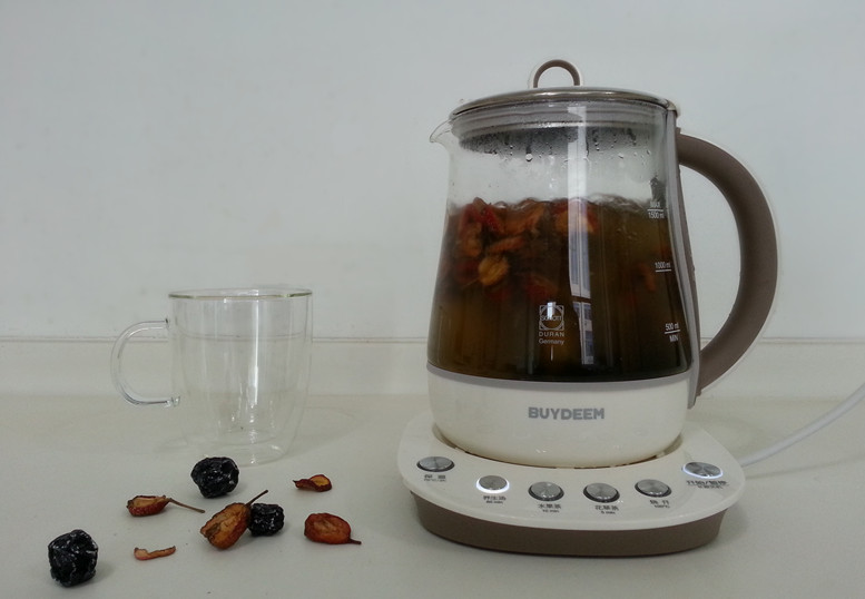 ▼将所有的食材用清水冲洗干净,放入养生壶中,加水至1500ml水位线,开始养生汤模式。