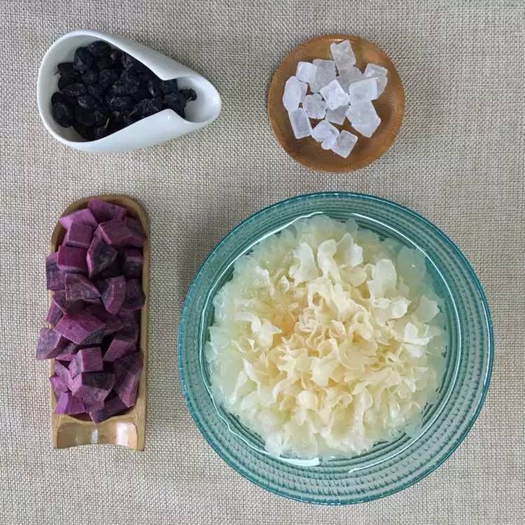 ▼银耳要提前泡发,紫薯切块,黑加仑洗净