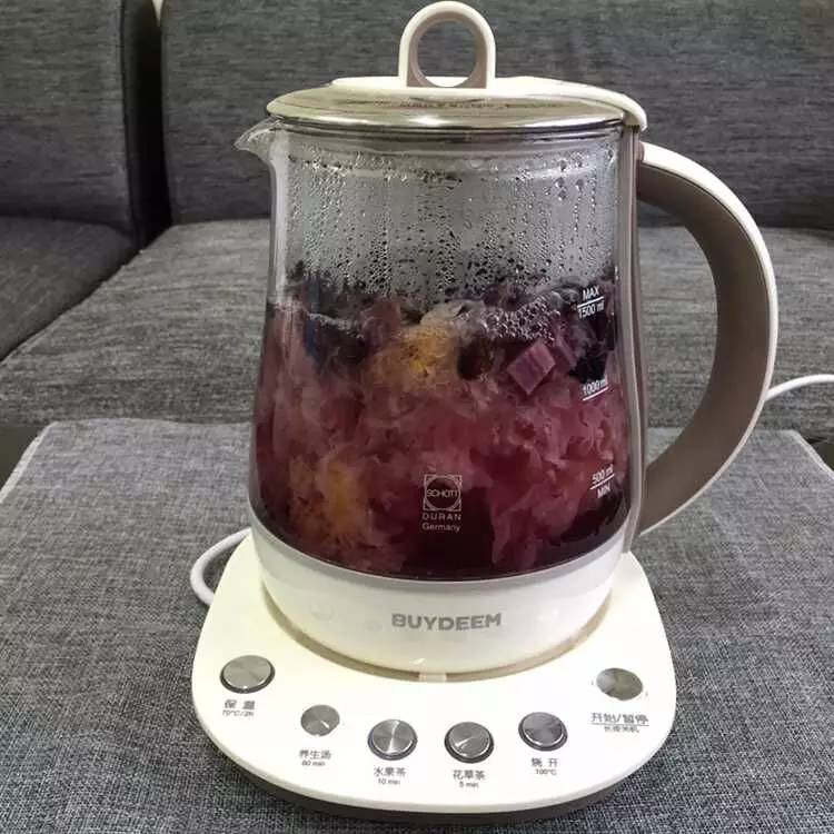 ▼泡发的银耳加水1200ml用养生壶煮一小时,煮至50分钟时再加紫薯与黑加仑,减少花青素的降解损耗。