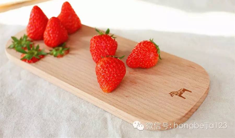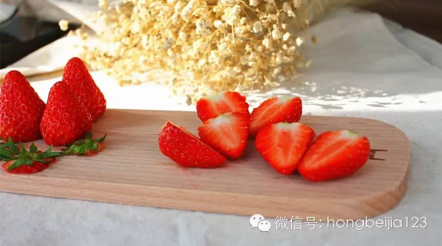 ▼ 将草莓洗干净,并切成大小相当的颗粒;建议每颗草莓切横竖两刀,分成四小块;