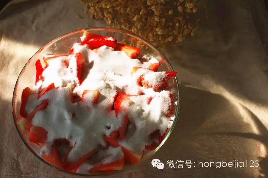 ▼ 将准备好的白糖与草莓混合均匀;因为白糖撒上之后,草莓之间的粘度会变得非常之高,所以一定要使劲儿的搅拌!白糖不仅有中和味道的作用,更主要是防腐,所以不能放太少;