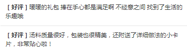 在12月25号,小北轻生活馆推出温情好礼——料包礼盒后,可谓是好评满满。小北默默的给晒礼盒、晒评论的真爱粉们分了个类: