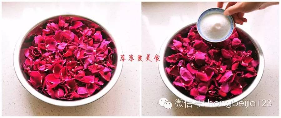 ▼将的食用鲜玫瑰花洗净吹干或用厨房纸吸干水分,加入白砂糖腌10分钟。