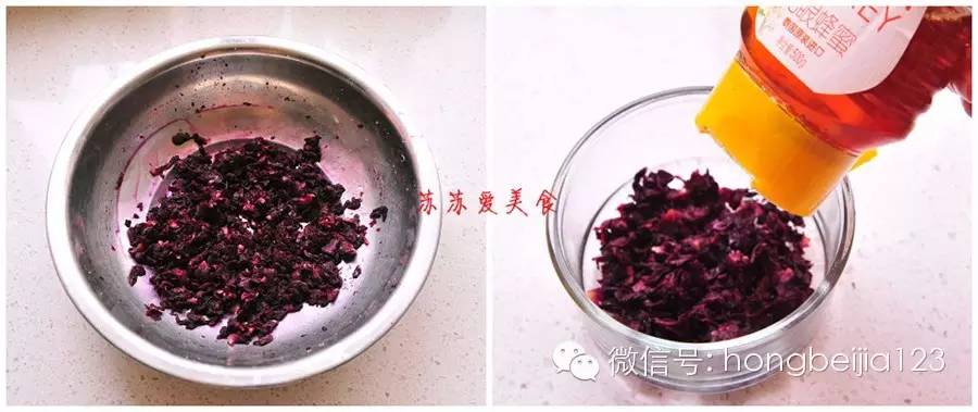 ▼带上一次性手套用手揉花瓣至和糖充分融合,取消过毒的容器,放上一层花瓣挤一层蜂蜜。