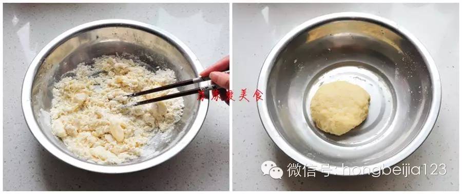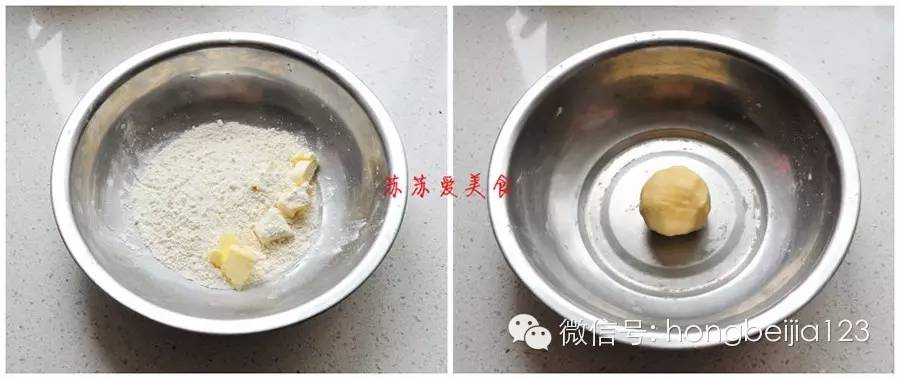 ▼将水油皮材料放一起拌成雪花状,再揉至光滑面团,盖保鲜膜冷藏静置1小时。