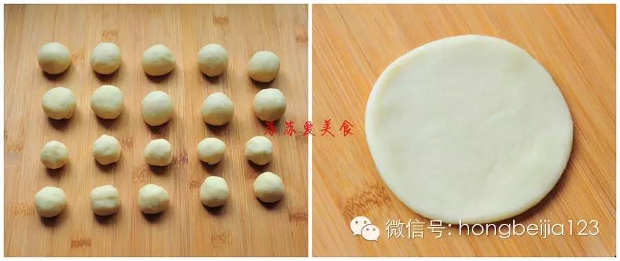 ▼取出水油皮的水油酥分别平均分成10份,取一个油皮面团按扁檊成圆饼。