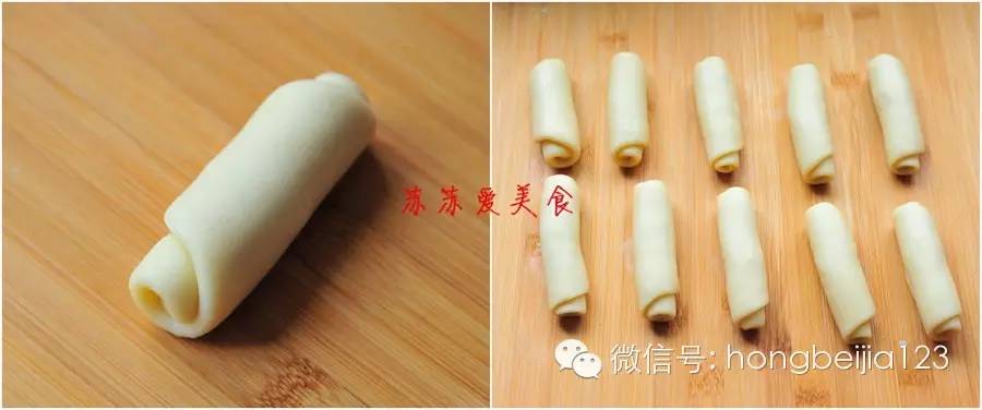 ▼取一个小筒按扁再檊成长舌状再卷成小卷,盖保鲜膜松驰15分钟。