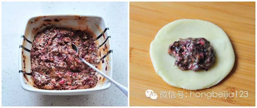 ▼提前将玫瑰酱拿出来,拌上炒熟的糯米粉和黄油冷藏备用。擀好的面皮上放上玫瑰馅。