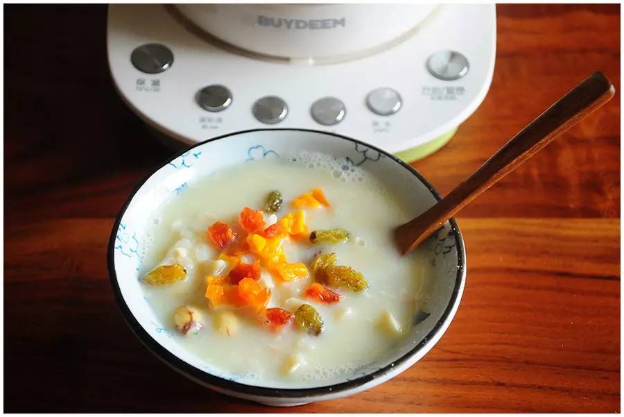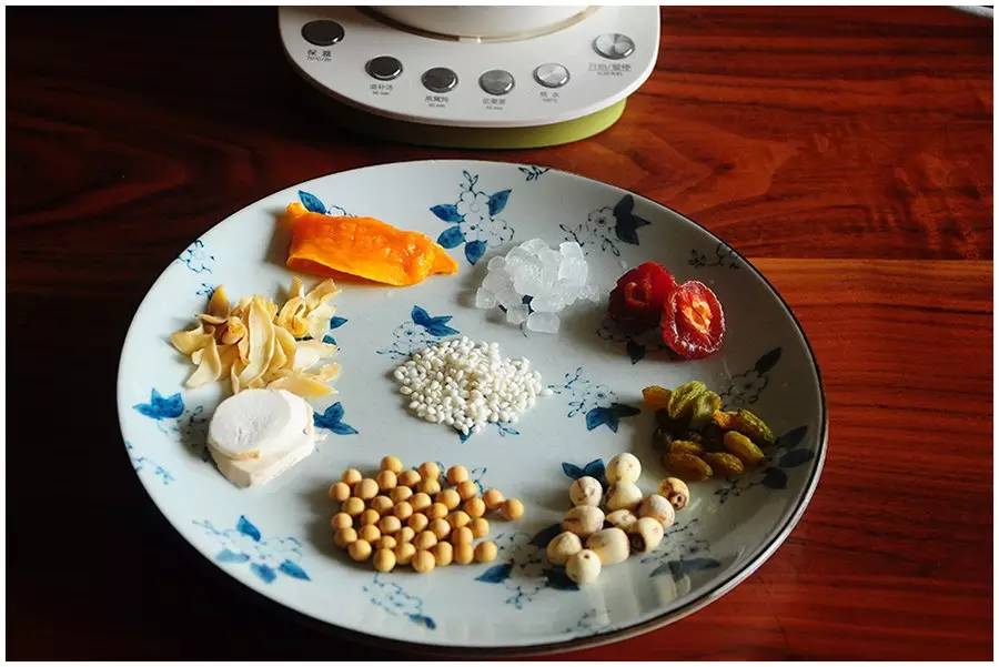 ▼准备好食材,黄豆制成豆浆(也可外购),糯米和其它干货浸泡两小时,使用北鼎燕窝粥模式30分钟即可,如果不事先浸泡就需要再加些时间。将浸泡好的食材混合,放入炖盅。