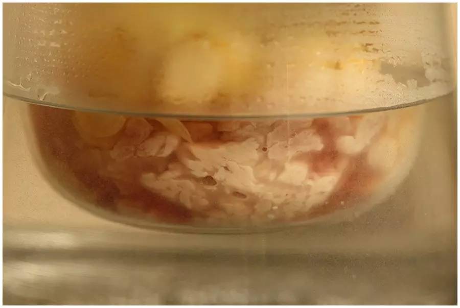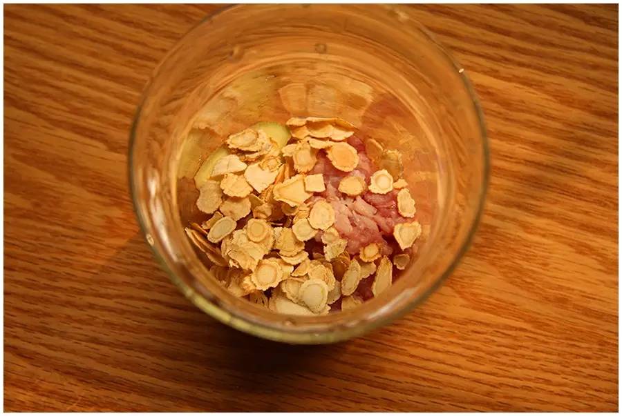 ▼瘦肉一小块,切片,再剁碎,放入炖盅,再加入纯净水和姜片浸泡45分钟,