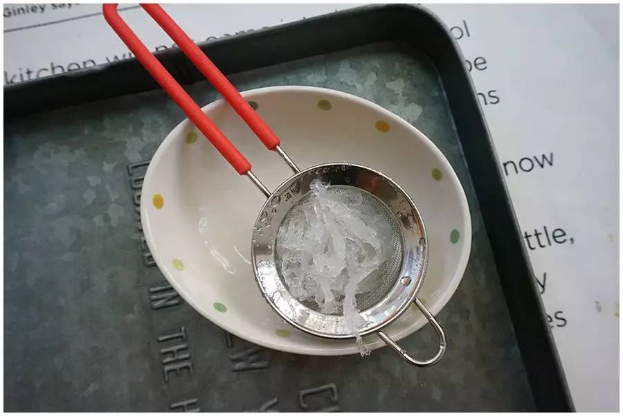 ▼用漏勺将燕窝稍稍冲洗掉杂志浮毛后滤掉水分。