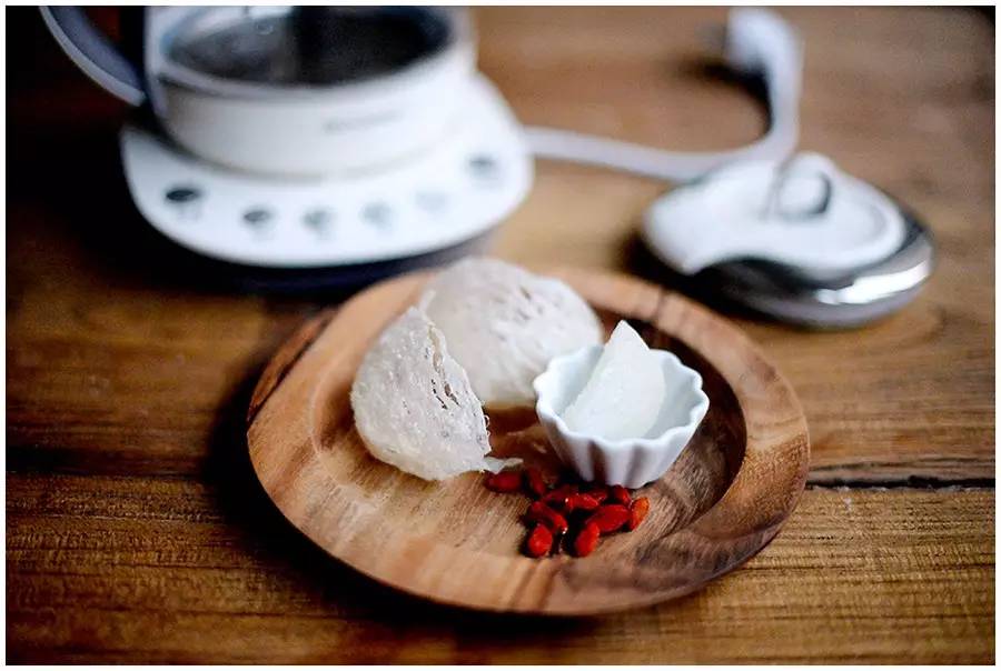 ▼燕窝洗干净后,先浸泡2小时。燕窝、枸杞、冰糖和水放入小养生壶中,水大概是养生壶的一半。