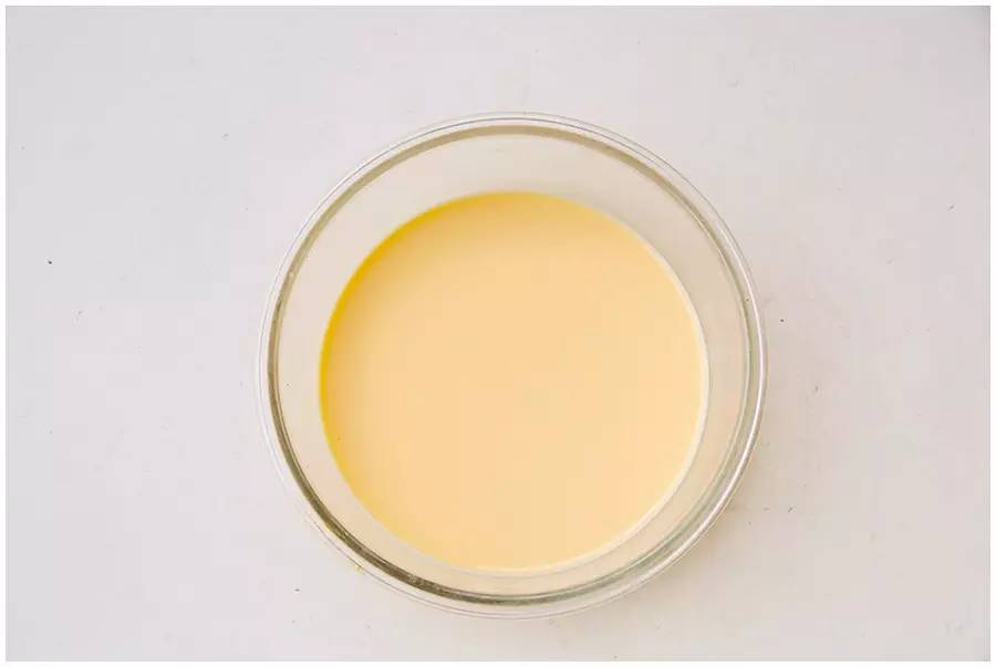 ▼将牛奶倒入蛋液中,搅拌均匀。