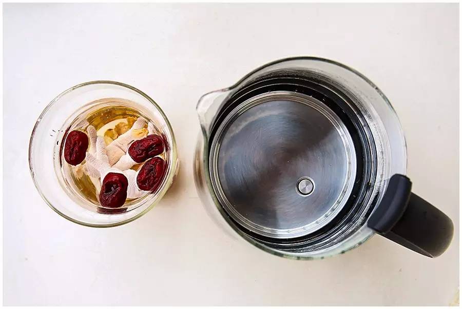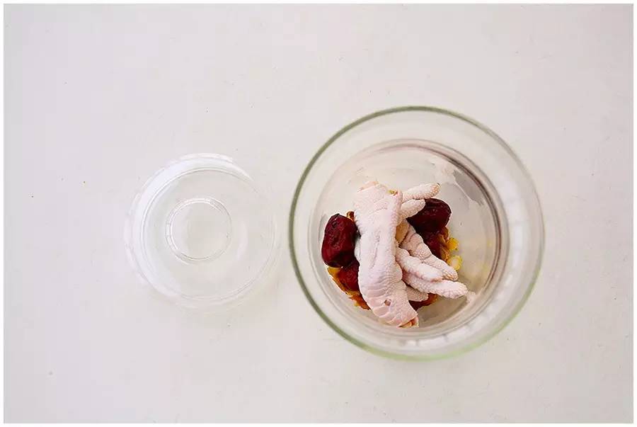 ▼将处理好的鸡脚、红枣和西洋参片放入炖锅中。