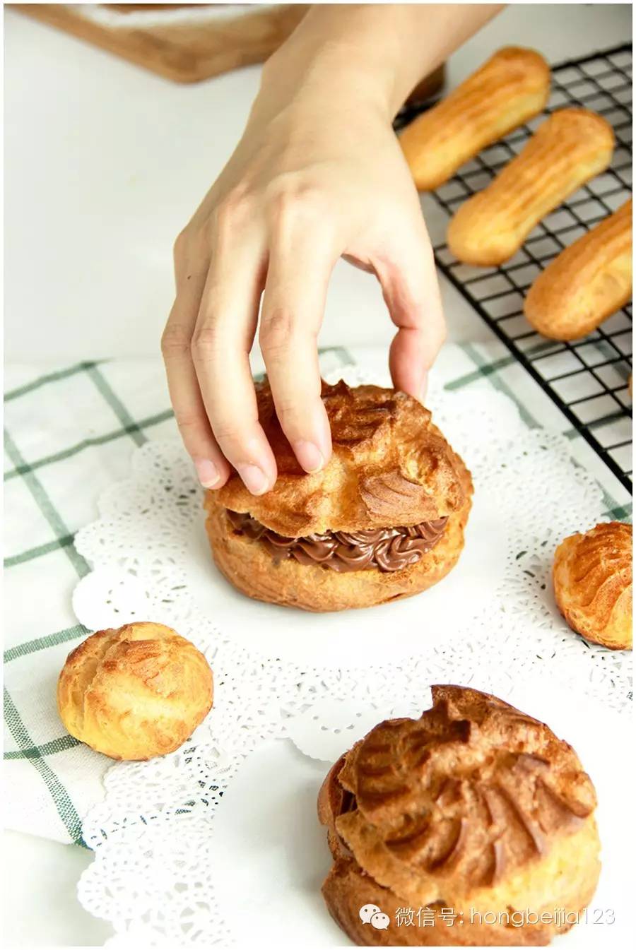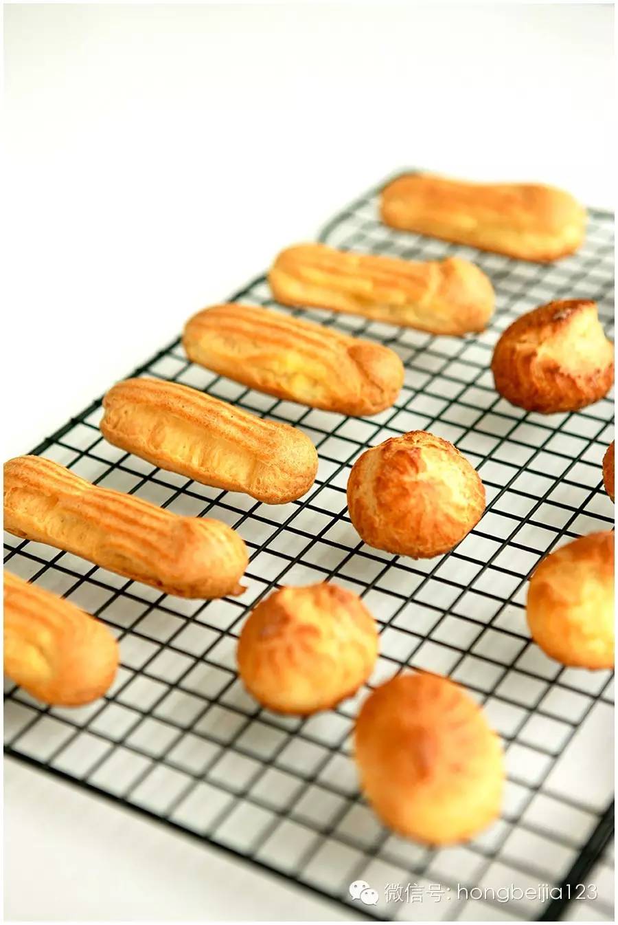 ▼做好的泡芙放凉以后,如果不是马上挤入内馅,可以常温保存数个小时。这个配方的面糊可以制作多种形状的泡芙,手指、迷你、大泡芙通杀。