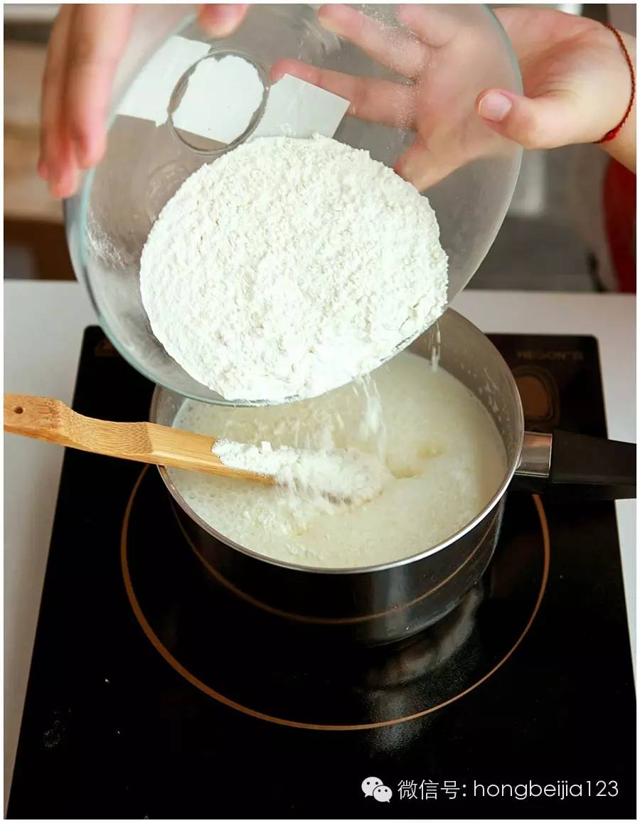 ▼面粉全部筛进沸腾的奶锅,保持小火,搅拌至面团成为比较粗糙的土豆泥的状态。