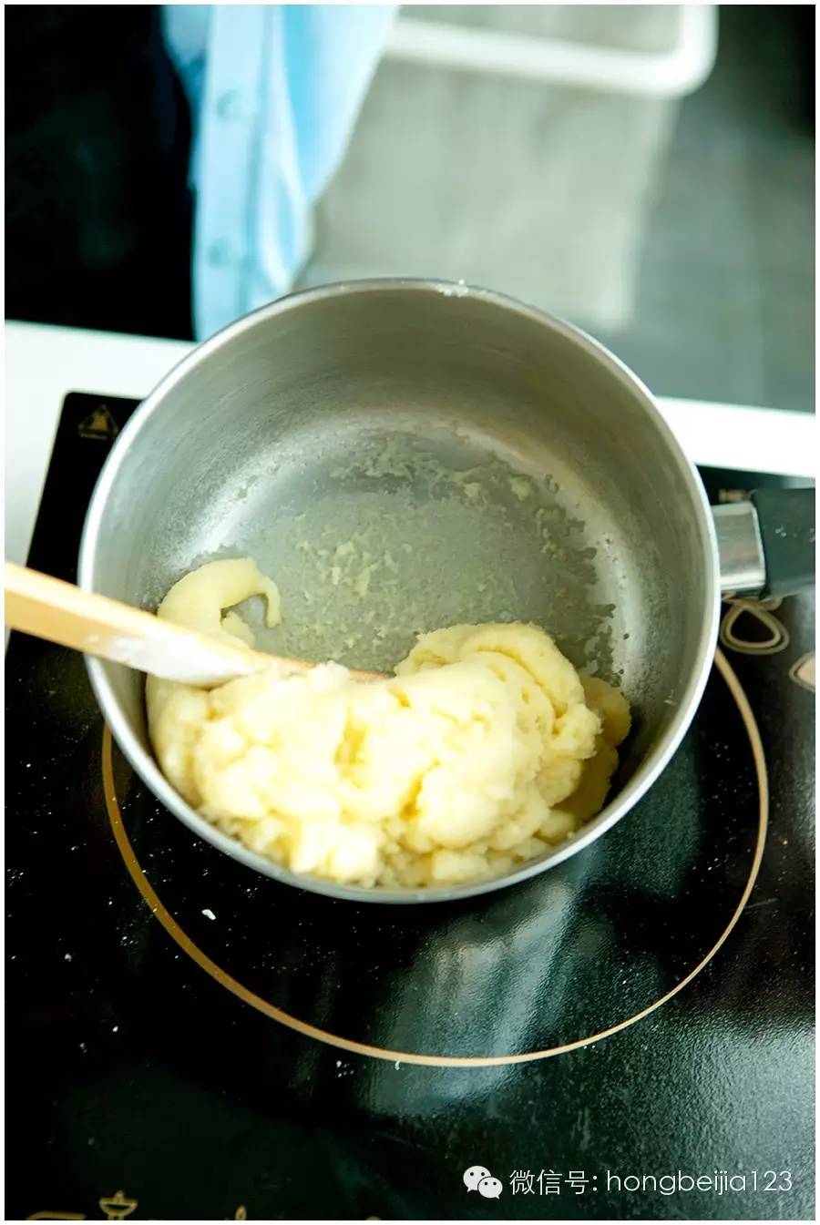 ▼到奶锅底部出现一层面团结成的薄膜关火,把面团从奶锅倒出。(完成后的面团是没有韧性和粘性,比较光滑的土豆泥的状态)