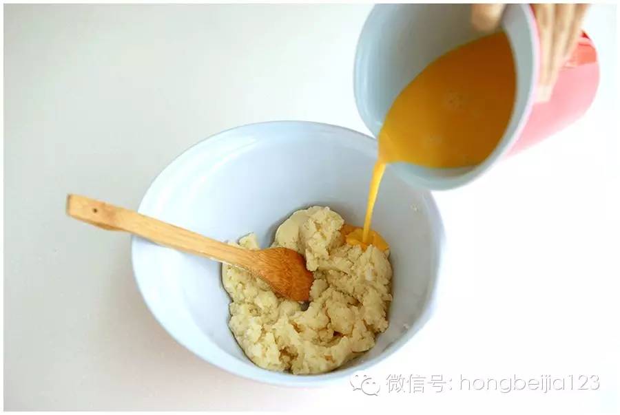 ▼倒进打蛋盆的面团先摊凉5~10分钟,等温度降到55度以下。(很重要,很重要,很重要)然后将鸡蛋液分3~5次加入,每次加入都要奋力搅拌至完全融合。最后一次加入鸡蛋液之前,根据面团的状态,酌情加入。