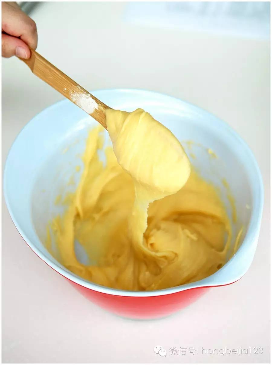 ▼如果面团呈现出,舀起的面糊从刮刀或者木铲上落下后,木铲上遗留的面糊呈倒三角的状态,长度大约4cm,就可以了。(如果此时鸡蛋液还有剩余,也不用继续加入。反之,若全部鸡蛋液加入还不到这个状态,就继续加鸡蛋。最后弄好的面糊应该仍然是温热的)