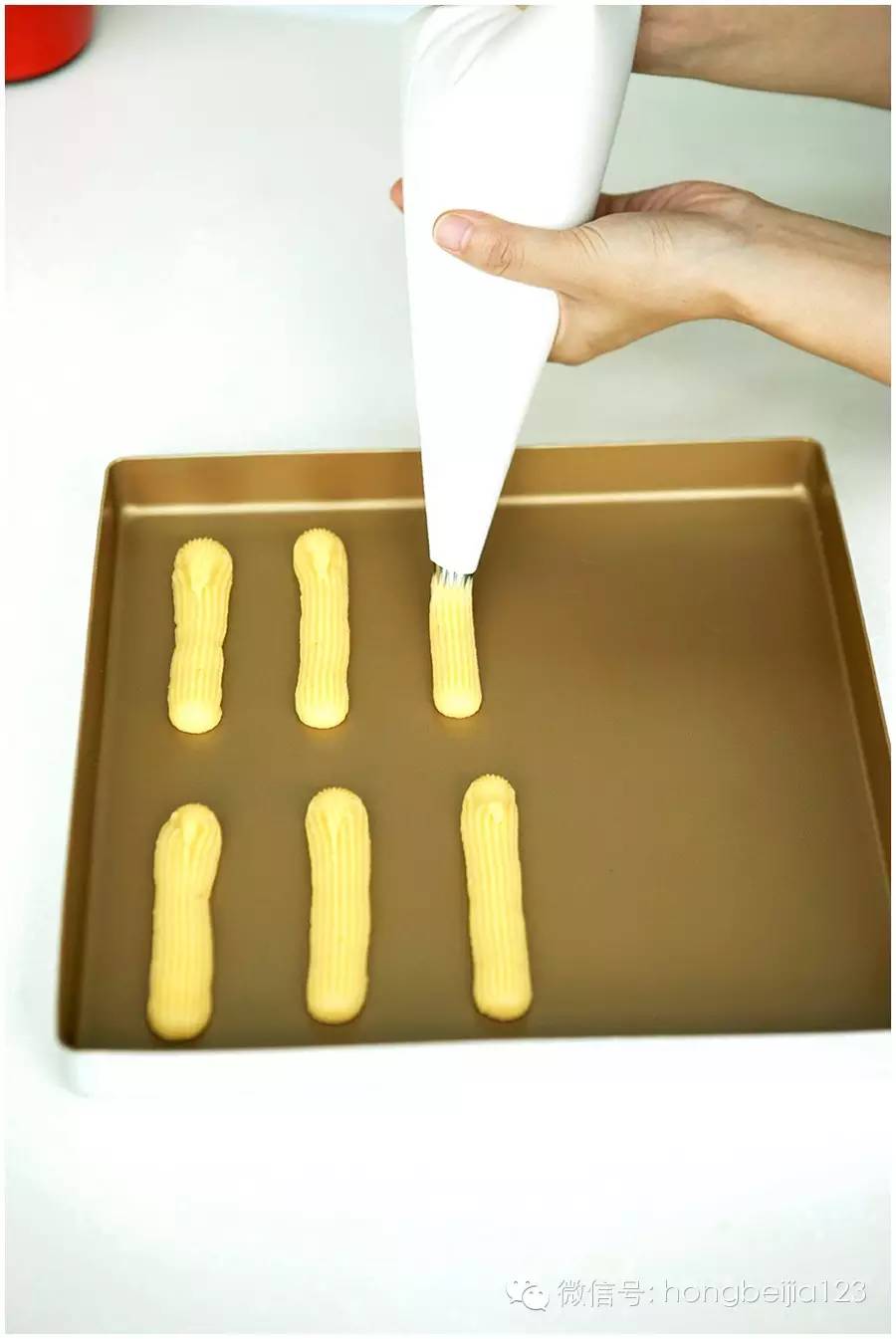 ▼烤箱预热210度,趁面糊还有温度,往烤盘上挤泡芙条。大约每条11cm,两条之间平行间隔5cm。