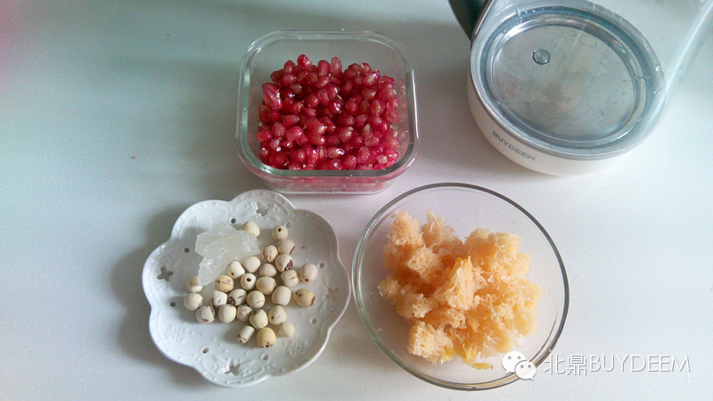 1.银耳提前泡发2小时,然后撕成小朵,将石榴去皮取出石榴籽,放在一边待用。