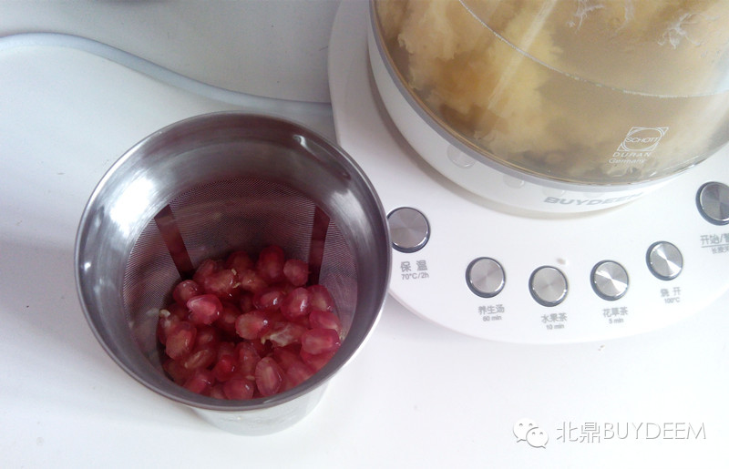 3.将石榴籽加入到养生壶中(不喜欢吃石榴的朋友可以将石榴放进茶蓝里面),启动水果茶模式待自动断电加入冰糖调味即可。