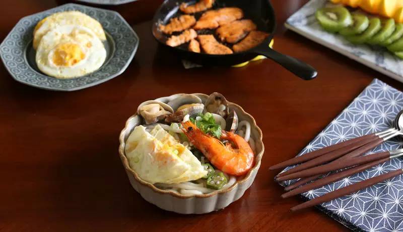 秋葵3根,虾6只,乌冬面一包,蚬子十个葱花、香菜少许,盐、玉米油少许