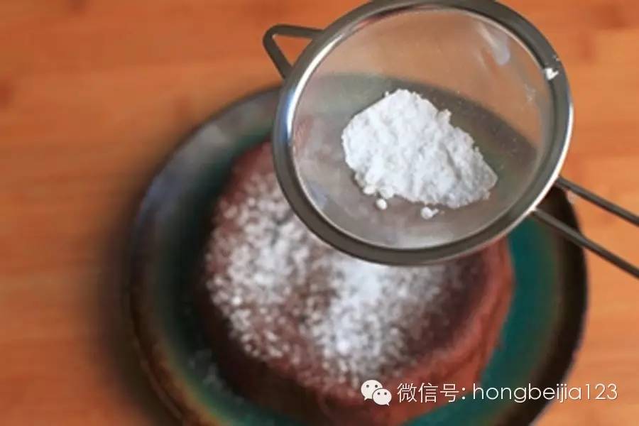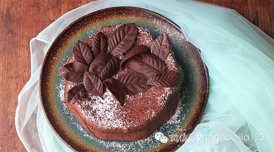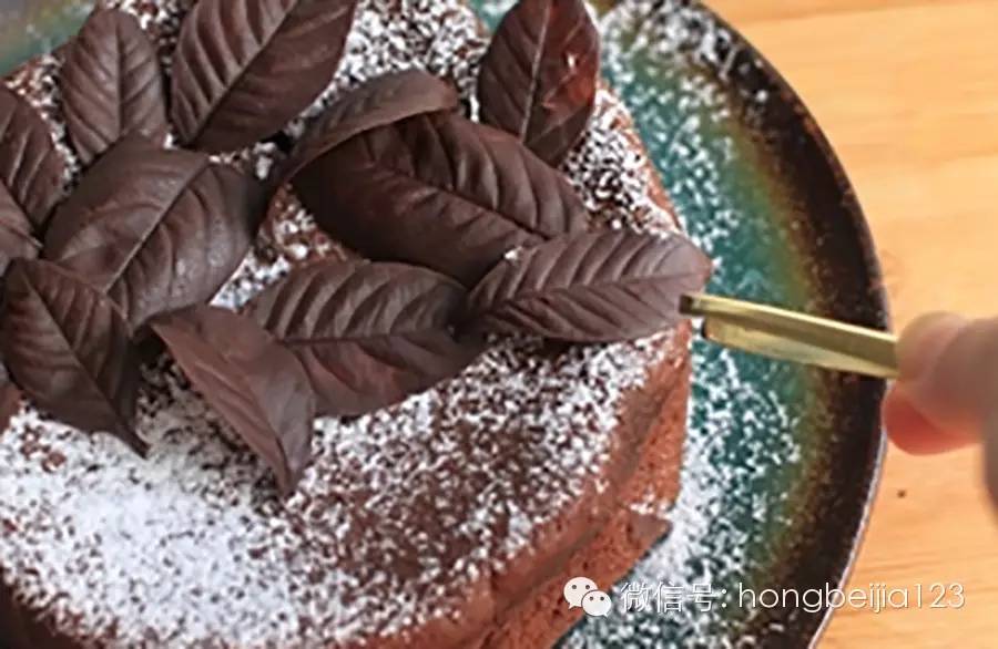 ▼最后装饰:在蛋糕表面筛上糖粉,将巧克力叶片放在蛋糕上即可。