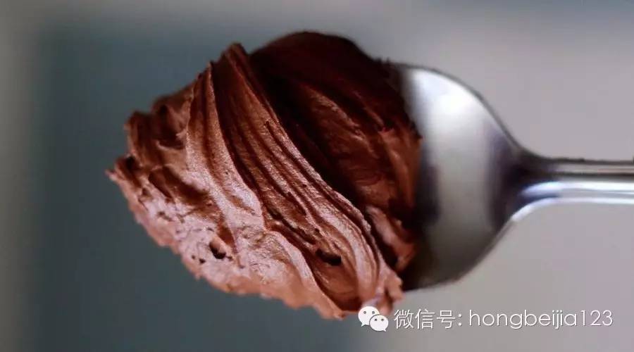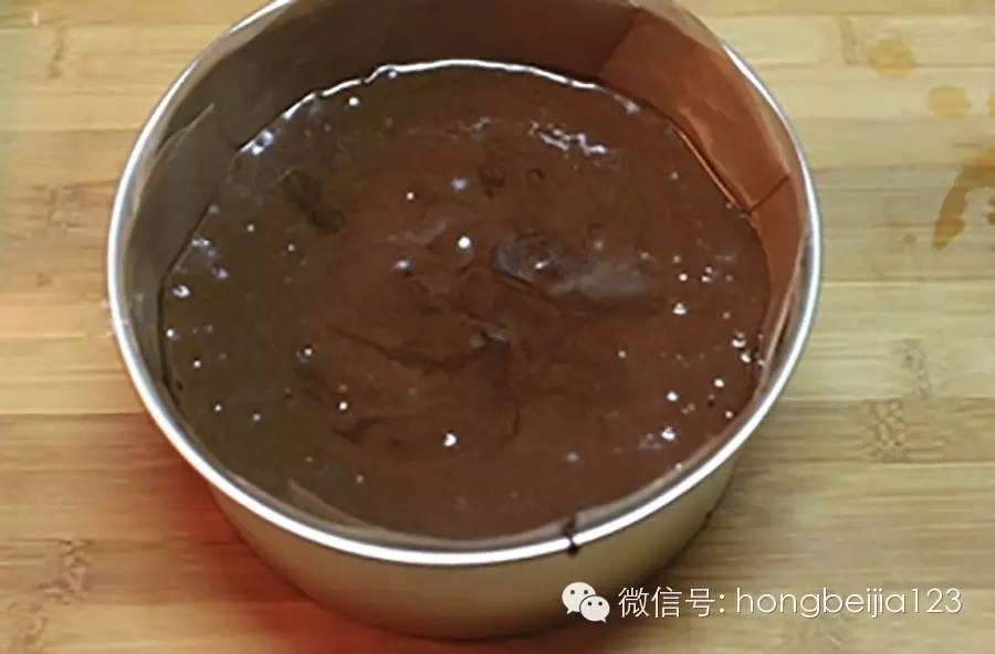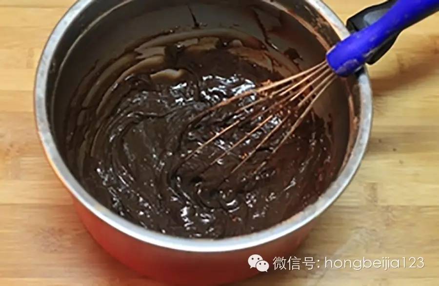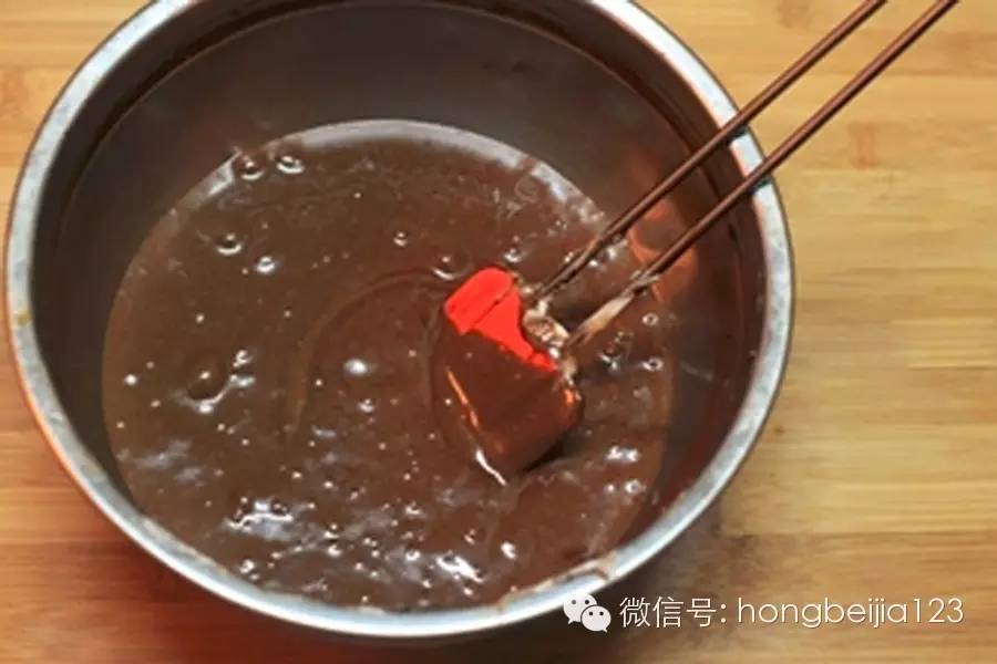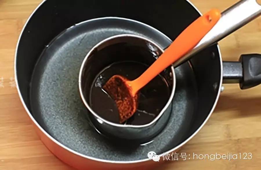 ▼巧克力、黄油和30克糖装在容器中,隔热水坐融。