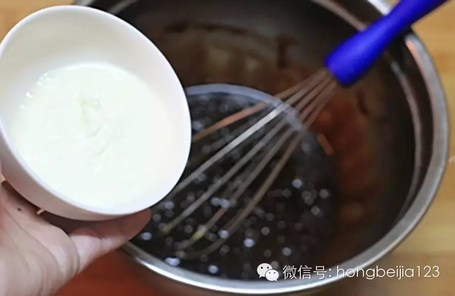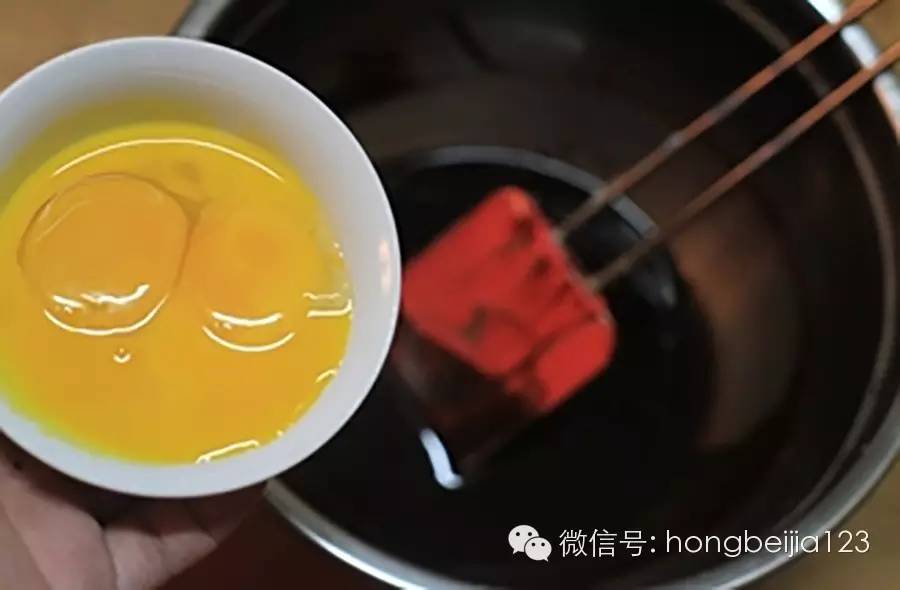 ▼待巧克力溶液的温度降至60度以下,分离蛋白和蛋黄,将蛋黄倒入巧克力溶液中搅匀。