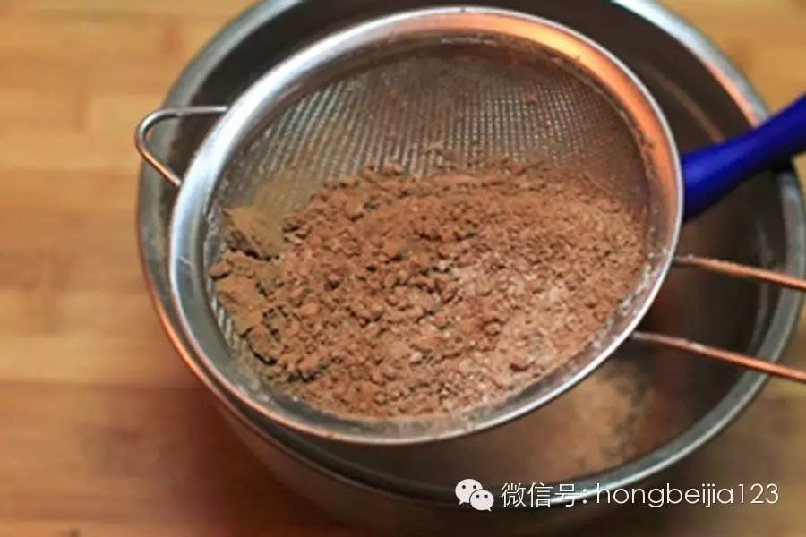 ▼低粉和可可粉过筛,加入步骤3溶液中,用手动打蛋器搅拌(温度较低的时候建议用一盆温热的水,隔水对巧克力面糊进行保温,因为巧克力面糊的温度太低时,会变得过于浓稠,难以与蛋白拌合),搅拌后的面糊状态,比较稠。