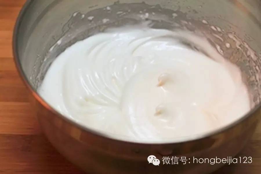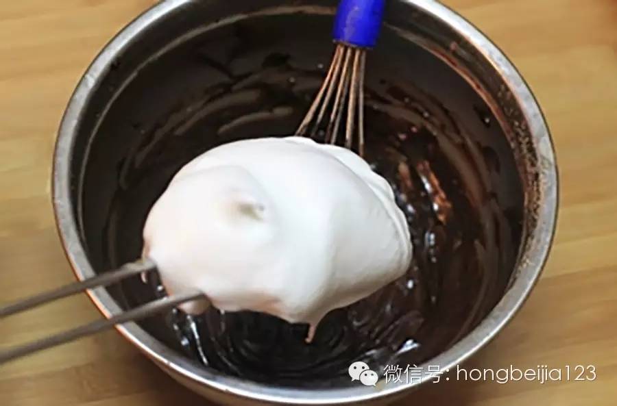 ▼蛋白分次加入60克糖,打发到有光泽而不糙,挺起小角,湿性发泡的样子,取1/3量的蛋白与巧克力面糊搅拌均匀,再把剩下的蛋白全部加进来,搅拌均匀,搅拌好的面糊是有光泽的。