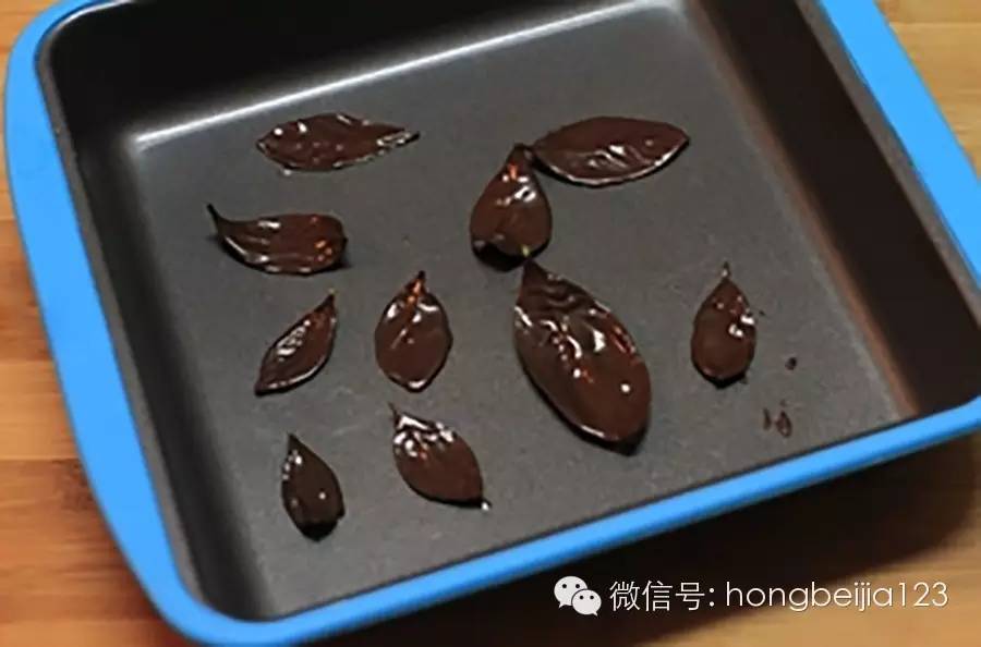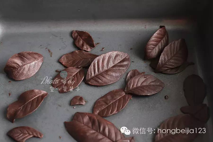 ▼巧克力落叶的做法:叶子提前用果蔬清洁净洗净、擦干,将巧克力隔水融化,用刷子涂在叶子背面,最好多涂几层。