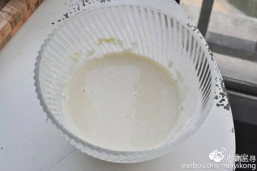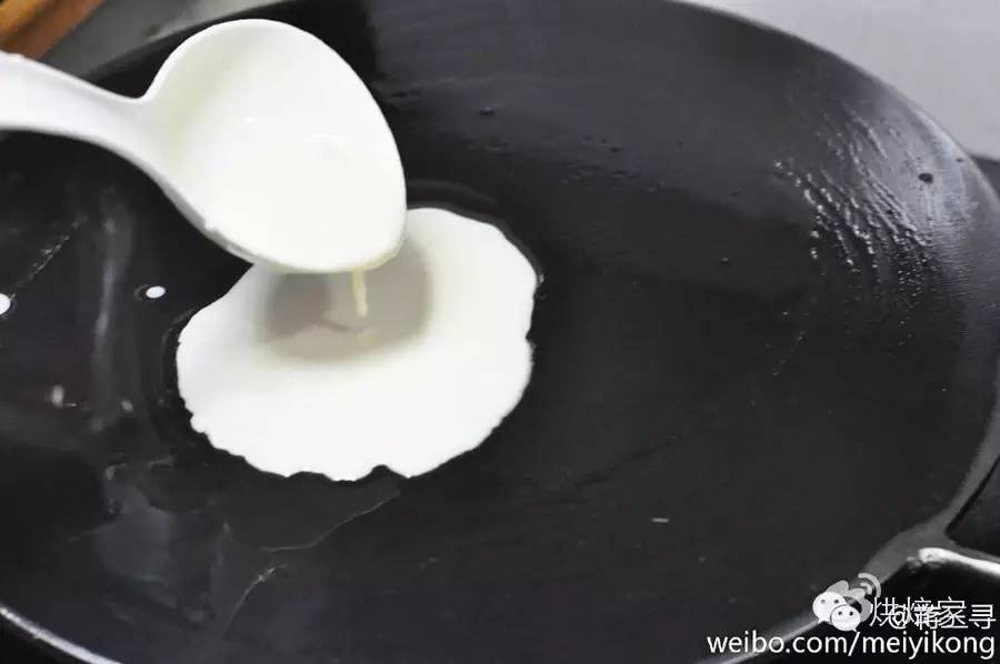 ▼煎锅加热,抹油,舀一勺面糊,均匀抹成饼。我用的是煎饼果子专用的铁板,如果没有的话用普通平底锅也行,就是材料的量要减少,做出来的也会是迷你型的煎饼果子。