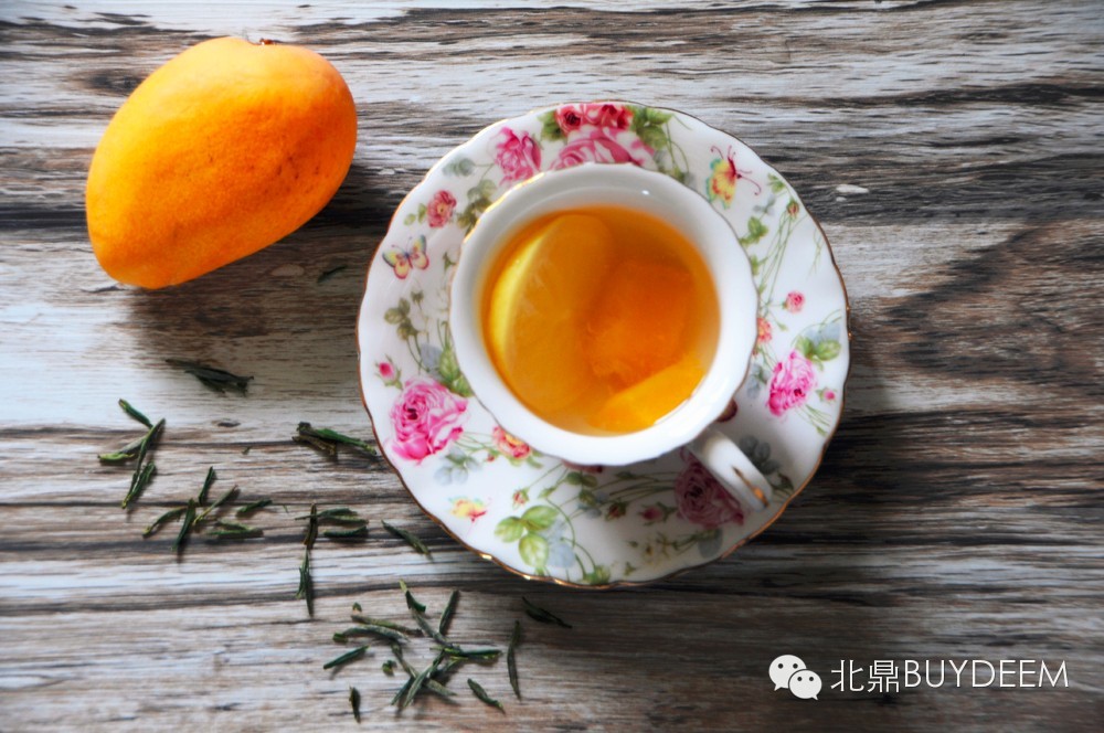 4.将煮好的芒果茶晾凉一些,放入柠檬片泡5分钟即可。