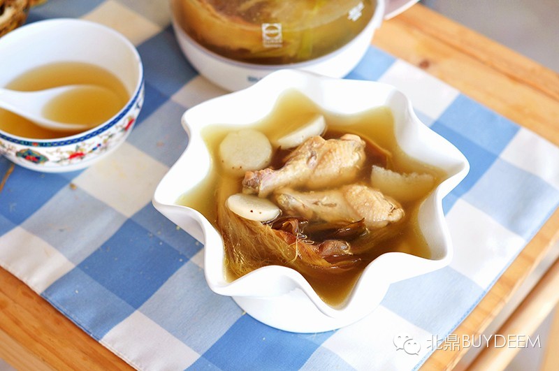 1、将鸡腿2只切成小块,放入北鼎养生壶中;