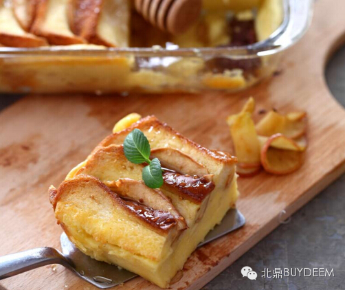 2.在烤盆中抹上一层薄薄的黄油,将切好的面包片和裹匀了蜂蜜的香蕉片在里面交替叠放,码好。
