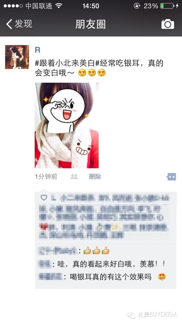 第二步:分享这张照片到微信朋友圈,“显白”一下,记得要加上 #跟着小北来美白# 的话题,也可以分享自己的一些美白心得哦~