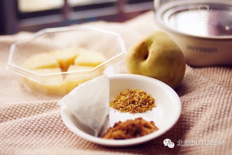 2. 桂花和红茶包放入过滤茶篮中,其余所有食材倒入养生壶中,加水至1500ML,开启【水果茶】模式。