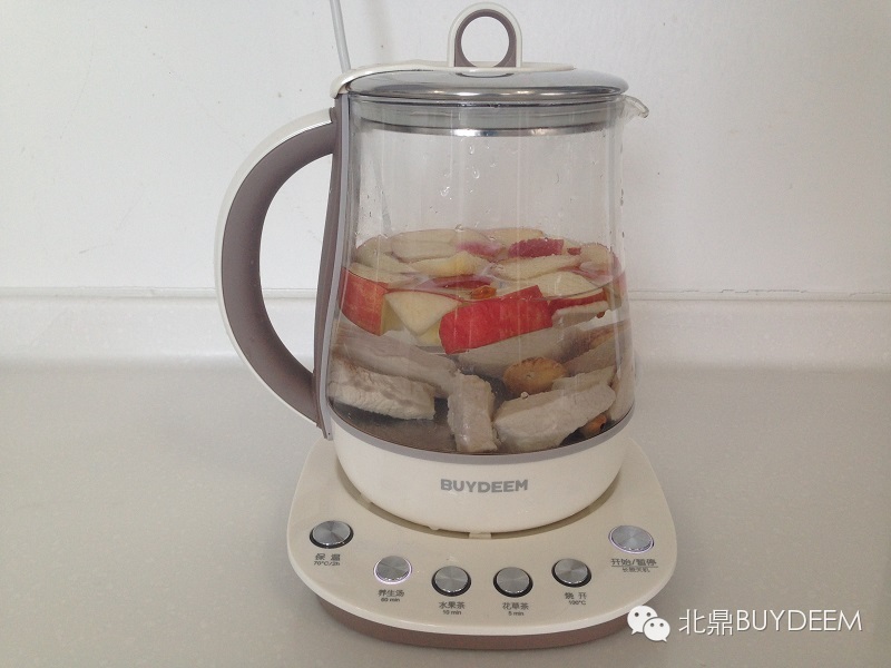 3、将苹果、南北杏、无花果洗净,苹果去核切块。将所有食材放入北鼎养生壶,加水至1200ML左右,启动养生汤模式。
