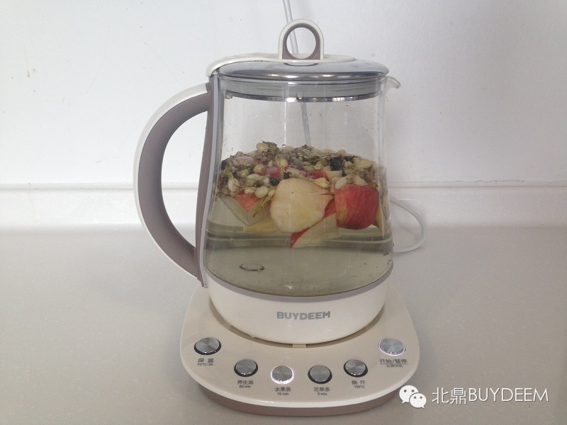 1、苹果洗净去核,切块后,将所有食材放入北鼎养生壶。