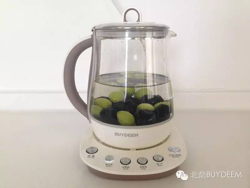 2、乌梅清洗干净,和处理后的橄榄一起放入养生壶,加水至1200ML,启动养生汤模式。