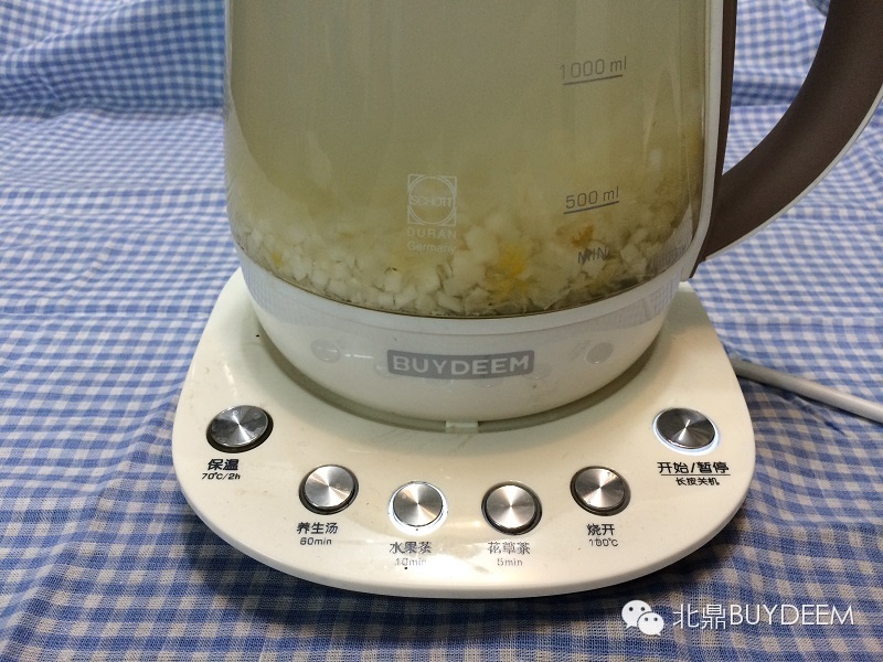 3、将上述食材放入养生壶,加水至1500ML,启动水果茶模式。