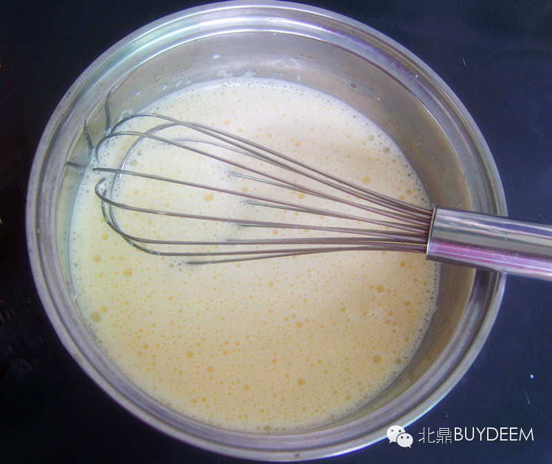 6.将牛奶和椰子汁按1:1比例和切碎的芒果、细砂糖用打蛋器搅匀。(家里如果没有打蛋器,用勺子也可以的。如果有搅拌机那就更好咯)