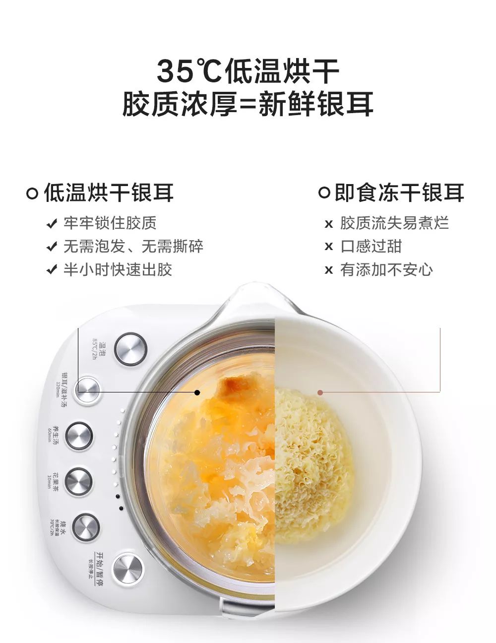 不同于传统的银耳羹,要先泡发,再撕成合适的大小,过程麻烦不说,还不一定能煮的软糯,撕的太大不容易出胶、撕的太小又容易化。