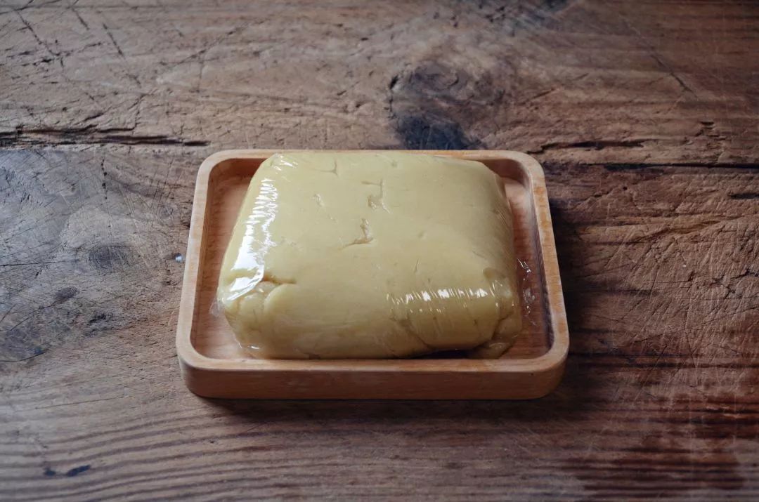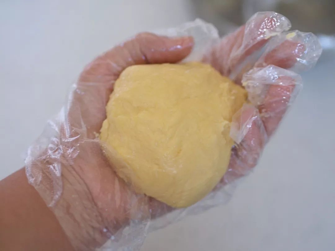 1. 将蛋黄与炼乳混合搅拌均匀,加入过筛后的低粉和泡打粉,混合成团后包保鲜膜放入冰箱冷藏松弛半小时。