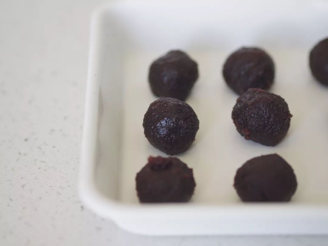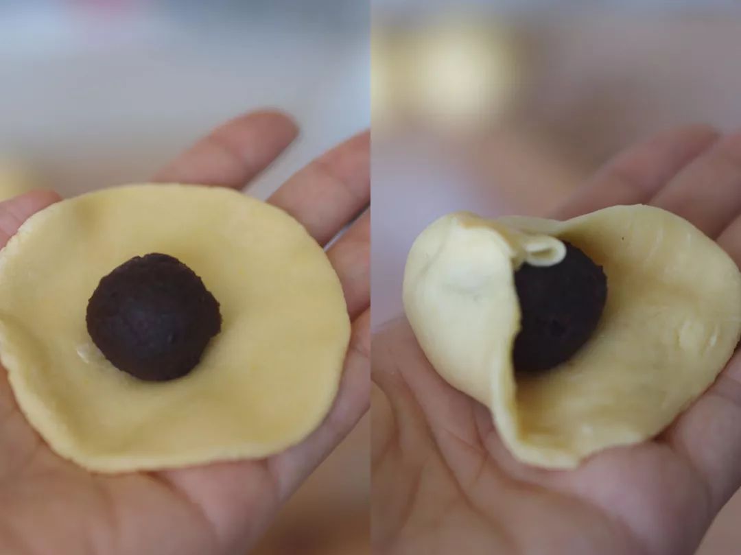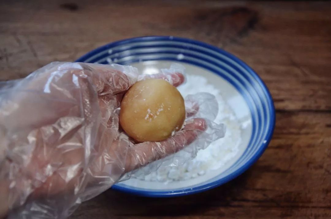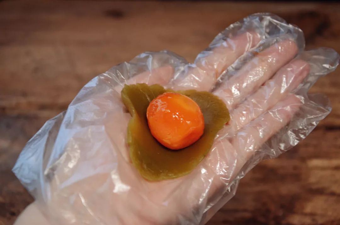 4. 将抹茶内陷分成一个为15g的剂子;蛋黄完全冷却之后、将抹茶馅剂子摁压,包入蛋黄,然后均匀的包起来;将所有内陷全部包好;
