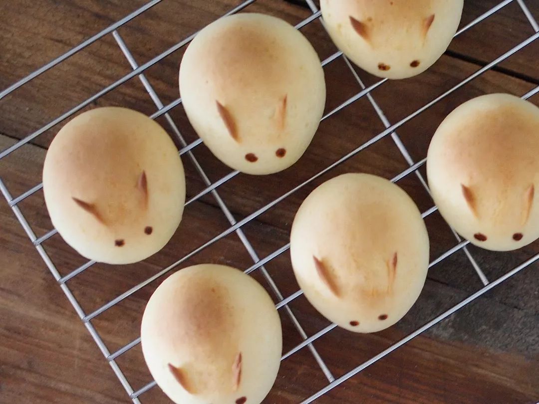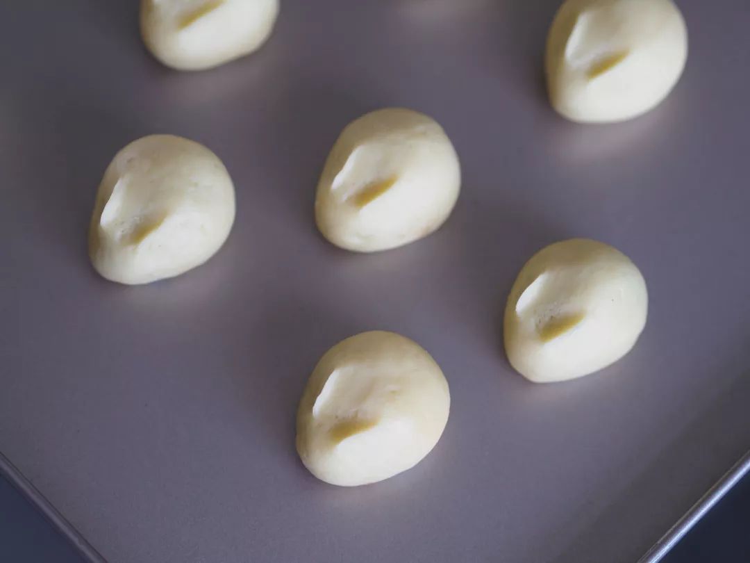 3. 将面团擀成中间厚四周薄的小圆饼,将豆沙馅包裹在里面。收口处冲下,整理成鸡蛋型。4. 用指尖捏出耳朵,再用剪刀将后半部分剪开。