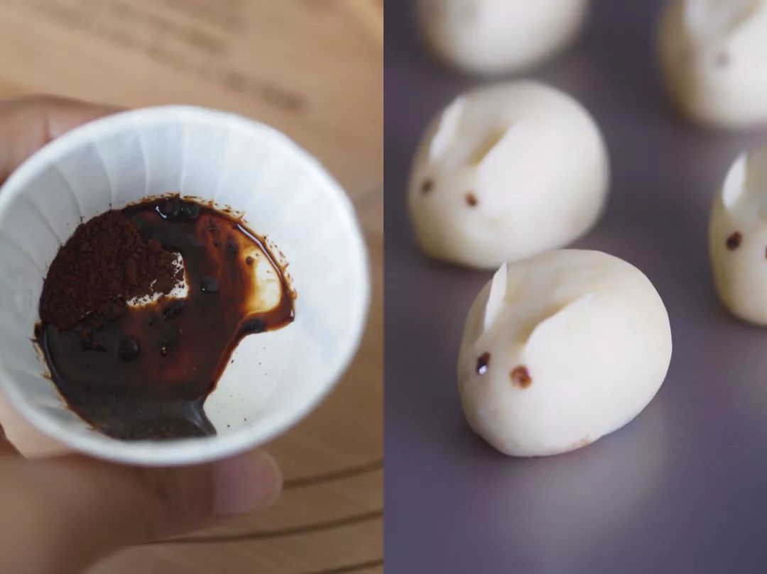 5. 速溶咖啡用少许水溶化,用牙签点出兔子眼睛。烤箱中层偏下,175℃/18分钟。